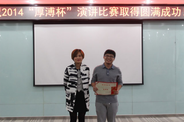 武漢厚溥教育科技有限公司的劉蔚老師最后對大賽進行總結(jié),劉老師首先祝賀所有獲獎的同學(xué)以及老師們,同時也希望各位還未獲獎的同學(xué)再接再勵,爭取在以后的比賽中取得優(yōu)異的成績;劉老師也指出舉辦“厚溥杯”演講比賽的目的是旨在提升學(xué)生的溝通表達(dá)能力,最終能夠提升同學(xué)們的綜合素質(zhì)能力。劉老師也希望同學(xué)們能夠把厚溥的企業(yè)文化以及比賽的賽況帶回到自己的學(xué)校,將厚溥的企業(yè)文化以及比賽精神分享給校區(qū)其他的同學(xué),最后,劉老師宣布2014年度“厚溥杯”演講比賽取得圓滿成功!