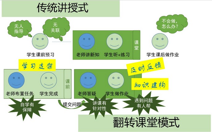 通常情況下,學生的學習過程由兩個階段組成:第一階段是“信息傳遞”,是通過教師和學生、學生和學生之間的互動來實現的;第二個階段是“吸收內化”,是在課后由學生自己來完成的。由于缺少教師的支持和同伴的幫助,“吸收內化”階段常常會讓學生感到挫敗,喪失學習的動機和成就感。“翻轉課堂”對學生的學習過程進行了重構。“信息傳遞”是學生在課前進行的,老師不僅提供了視頻,還可以提供在線的輔導;“吸收內化”是在課堂上通過互動來完成的,教師能夠提前了解學生的學習困難,在課堂上給予有效的輔導,同學之間的相互交流更有助于促進學生知識的吸收內化過程。