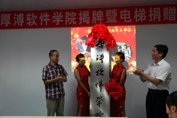 在熱烈的掌聲和歡快的音樂聲中,校黨委書記韓德鋒、武漢厚溥教育科技有限公司董事長(zhǎng)陳相陽共同為“厚溥軟件學(xué)院”揭牌。隨后舉行了電梯捐贈(zèng)儀式。